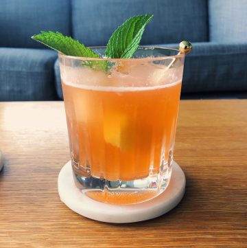 We bought a box of pineapple juice to make our favourite vacation cocktail, the Singapore Sling. What that really means is we used an ounce or two and now have the rest of the box lingering in our fridge. Time to put it to use again in this recipe along with other bar essentials! The main spirit in this drink is gin, only an ounce which keeps the cocktail quite low in alcohol. For that beautiful bight orange colour, I used Aperol which surged in popularity last summer. I don’t think this bitter sweet orange apertif is going anywhere soon. It’s definitely worth having around in your liquor cabinet for this and many other summery sippers. I hope you enjoy shaking this one up accompanied by hot and sunny weather. Cheers!