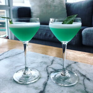 - Strain into a chilled coupe glass and garnish with a sprig of mint. Enjoy!